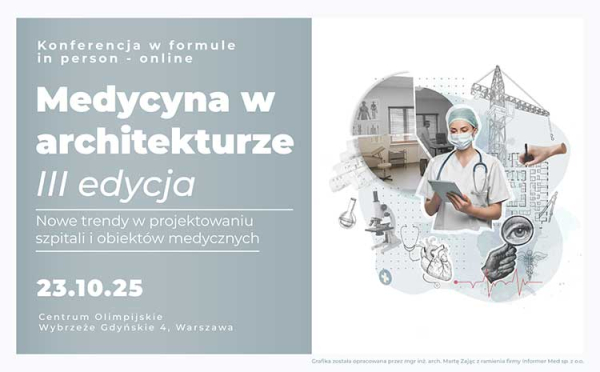 Już za niespełna 3 tygodnie, 23.10.2025 roku odbędzie się w warszawskim Centrum Olimpijskim trzecia edycja konferencji „Medycyna w architekturze”. Tym razem tematem głównym imprezy będą standardy projektowania obiektów infrastruktury medycznej sprzyjających rekonwalescencji, a obrady będą podzielone na część Soma i Psyche.