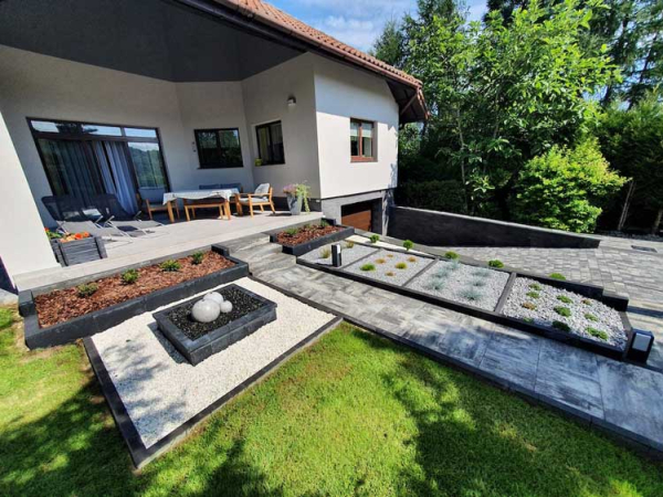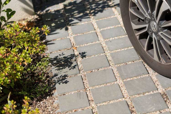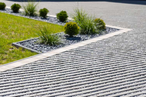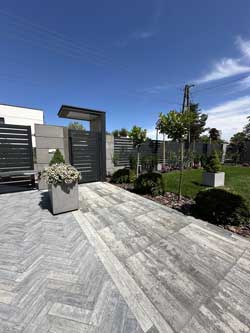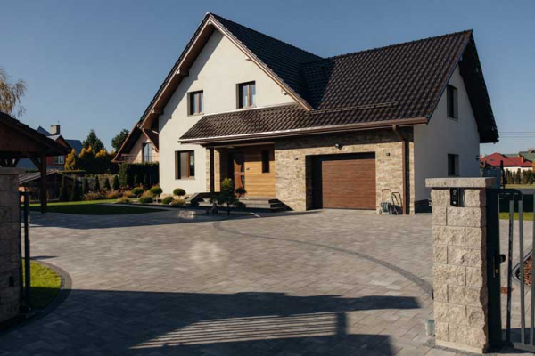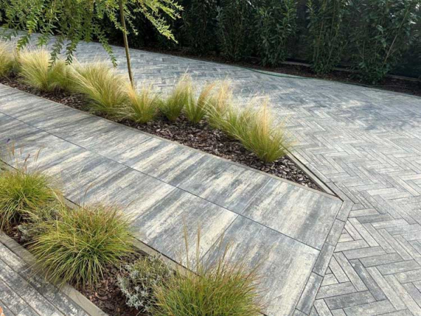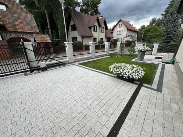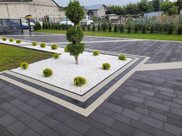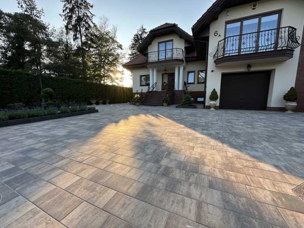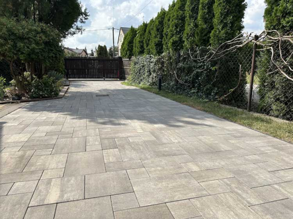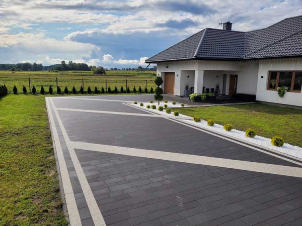 Mimo że solidność i bezpieczeństwo wjazdu są najważniejsze, nie należy zapominać o jego estetyce. To właśnie wjazd często jako pierwszy wita wchodzących i gości, stając się wizytówką danej posesji. Odpowiednio wybrane formaty, faktury i kolory powierzchni mogą uwypuklić charakter architektury budynku, współgrać z ogrodem lub stanowić kontrastowy detal. Na wjeździe efektownie prezentuje się długa i wąska (28x7cm) kostka Polbruk Metrik. Dostępna jest w dwóch fakturach – gładkiej i obijanej, modnych barwach szarości i kolorze skorodowanej blachy – korten. To, co odróżnia ją od innych kostek przeznaczonych na wjazd, to opcja ułożenia jej w elegancką jodełkę.  Warto też zwrócić uwagę na kostki Toledo, Triada i Commix. Toledo i Commix umożliwiają tworzenie atrakcyjnych mozaikowych wzorów, które dobrze współgrają z niemal każdym stylem. Triada, dzięki trzem różnym formatom, pozwala na swobodne kształtowanie powierzchni i dopasowanie jej do charakteru posesji. Dodatkowym atutem jest możliwość zestawienia jej z kostką Ekotriada, która nie tylko efektownie wygląda, lecz też zapewnia 14% powierzchni biologicznie aktywnej.