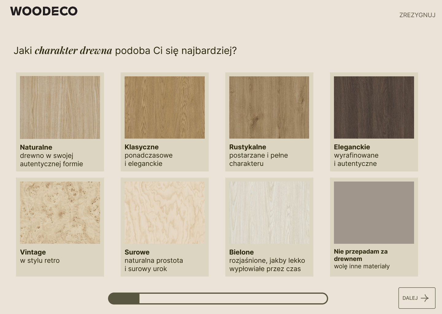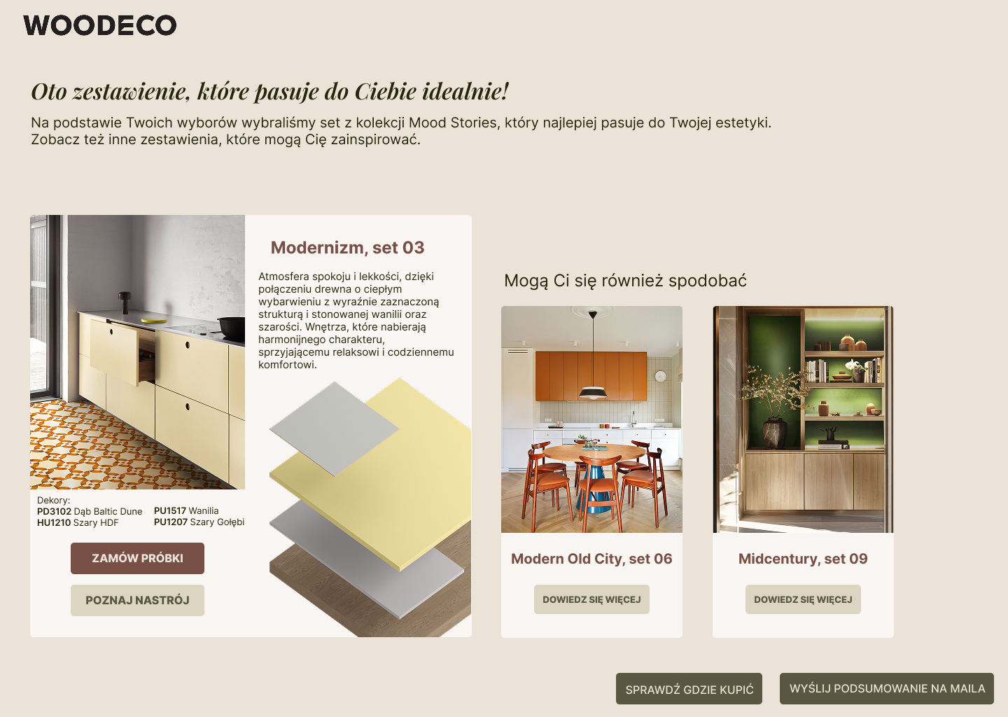 Masz problem z określeniem, który styl aranżacji będzie dla Ciebie odpowiedni? Czujesz się zagubiony w natłoku materiałów wykończeniowych i nie potrafisz ich ze sobą skomponować w projekcie? Poznaj DecoMate, innowacyjne rozwiązanie od Woodeco, które udowadnia, że wirtualne dopasowanie może być proste, inspirujące i efektywne. Za pomocą interaktywnej ankiety w parę chwil określisz swój gust, uzyskasz dostosowane propozycje dekorów, a próbki będziesz mógł zlecić bez ruszania się z domu.
