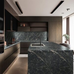 Kontrastem dla marmuru jest eleganckie, ciemne drewno, które ogrzewa przestrzeń i dodaje jej naturalnego wdzięku. W tej roli doskonale sprawdzają się Orzech Willa PD5014 oraz Dąb Millenium PD3117. W otoczeniu subtelnych beży, głębokiej czerni i złocistej szczotkowanej stali (dekor Inox Miedź PF8032 oraz Inox Beż PF8030), całość zyskuje na klasie i finezji. To zestawienia dekorów, które zachwycają swoją harmonią i idealnie się dopełniają.