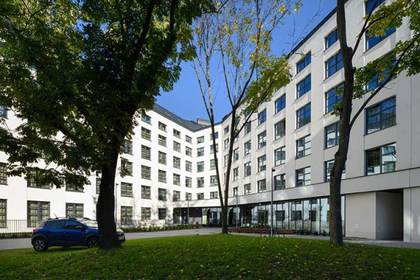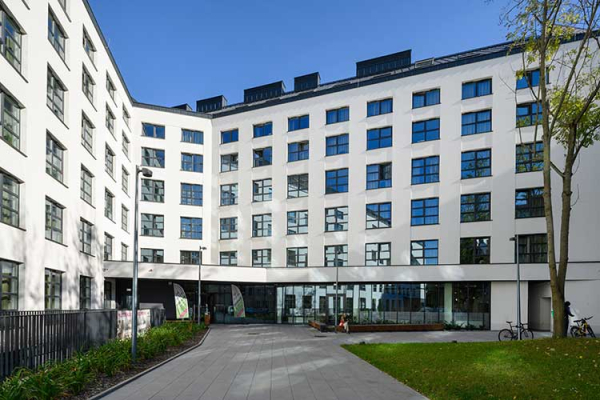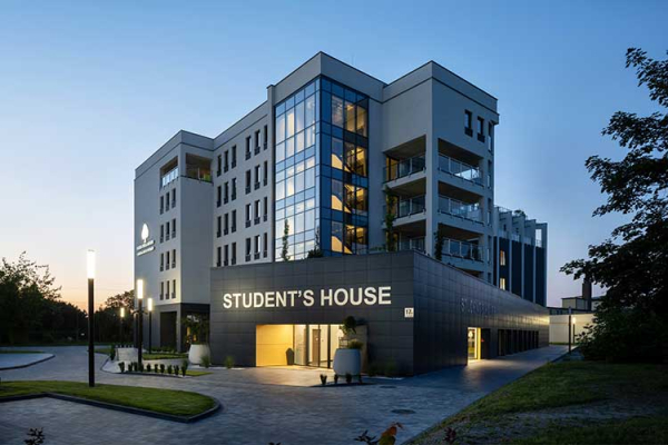 Architektura budynku opiera się na harmonijnym połączeniu odrestaurowanej zabytkowej części z nowoczesnymi skrzydłami o prostych formach i dużych przeszkleniach. Łączy to akademicki klimat z komfortem XXI wieku. Duże przeszklenia nadają bryle lekkości i doświetlają wnętrza, a nowoczesne systemy stolarki, takie jak drzwi MB-86 i przeciwpożarowe konstrukcje MB-78EI firmy WIŚNIOWSKI, gwarantują bezpieczeństwo i trwałość. Studenci mają dostęp do nowoczesnych pomieszczeń i przestrzeni wspólnych (do nauki, spotkań i relaksu), które dzięki przemyślanej konstrukcji sprzyjają integracji i aktywnemu życiu akademickiemu. Duże przeszklenia zapewniają bliskość światła dziennego i interakcję z otoczeniem, a stolarka WIŚNIOWSKI sprawia, że budynek jest bezpieczny, energooszczędny i trwały.