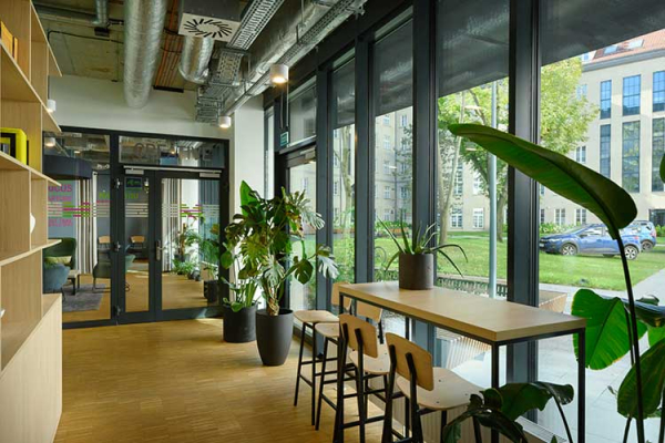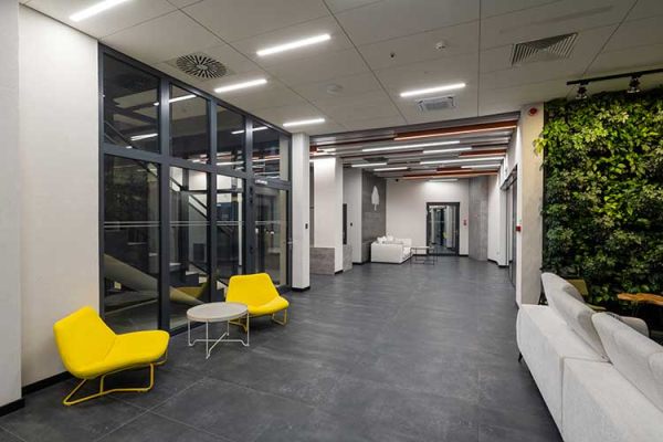 - Fasady słupowo-ryglowe MB-SR50N HI+ – przeszklenia, które wpuszczają naturalne światło do wnętrza i dodają budynkowi lekkości. Zastosowane przeszklenia charakteryzują się doskonałą izolacyjnością termiczną.