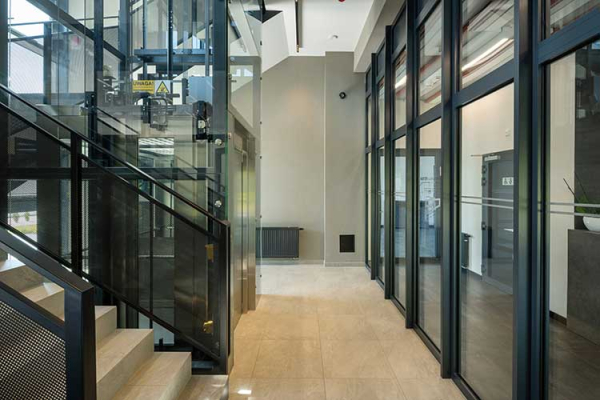 - Montaż wind w systemie MB-45 – lekkie witryny aluminiowe dodają elegancji przestrzeni komunikacyjnej, dbając jednocześnie o bezpieczeństwo użytkowników.