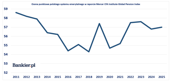 Eksperci Mercera przyznali Polsce 57 pkt w porównaniu do 56,8 pkt w roku poprzednim, co plasuje kraj w grupie państw oznaczonych kategorią "C”, w skali ocen od „A” do „E”, gdzie „A” symbolizuje najwyższą notę. W grupie ocen "C", polski system emerytalny uplasował się na czwartym miejscu za wspomnianymi Botswaną, Namibią i Panamą. Klasyfikację "C+" otrzymały przykładowo Kolumbia, Hiszpania czy Stany Zjednoczone.
