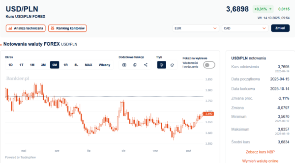 O 9:50 dolar zyskiwał na wartości o 1,3 grosza, osiągając poziom 3,6918 zł. Są to najobszerniejsze kwotowania pary dolar-złotych od  6 sierpnia, czyli od ponad dwóch miesięcy. Od wyznaczonego niemal miesiąc temu 4-letniego dołka kurs USD/PLN wzrósł już o 13 groszy.