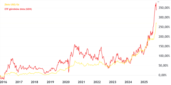 Dopiero gdy w 2024 r. zaczęto dostrzegać, że spółki zapanowały nad dynamiką kosztów, ich kursy rzuciły się w pogoń za ceną złota, która jeszcze przyspieszyła. Koszty co prawda rosły, ale wolniej i nie porównywalnie jak sama cena kruszcu. W 2024 r. złoto odnotowało stopę zwrotu na poziomie 27,2%. W 2025 r. ceny złota zdążyły wzrosnąć już o przeszło 60%.