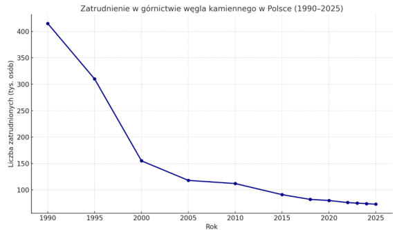 Zgodnie z danymi Agencji Rozwoju Przemysłu oraz Głównego UrzęduStatystycznego, aktualnie zatrudnienie w obszarze wydobycia węgla kamiennegosięga blisko 74 tysięcy osób. To przekłada się na zredukowanie o ponad 80 procent w porównaniu z początkiem lat 90.