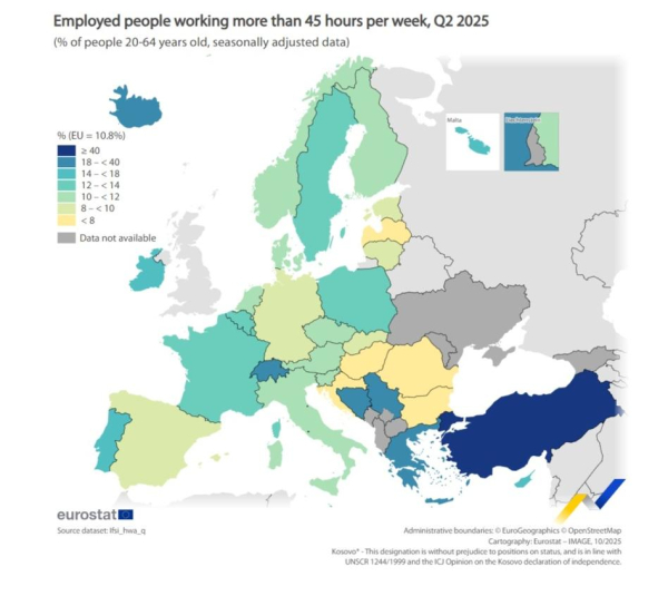 W drugim kwartale 2025 roku, 10,8% aktywnych zawodowo osób w wieku od 20 do 64 lat w obszarze UE wykonywało pracę łącznie przez ponad 45 godzin w tygodniu, sumując ich główne i dodatkowe zatrudnienia.