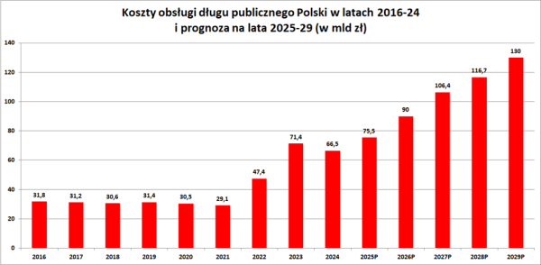 Ale ten kredytowy raj dobiegł końca w roku 2022, gdyinflacyjna erupcja zmusiła banki centralne do radykalnego podniesieniastóp procentowych. W efekcie wydatkina obsługę długu publicznego wzrosły z ok. 30 mld złotych w roku 2022 do 66,5mld zł, 75,5 mld zł zaplanowanych na rok bieżący oraz 90 mld zł w roku 2026. Wedługzałożeń Strategii w roku 2029 mają one wzrosnąć do ok. 130 mld zł, co mastanowić 2,64-2,68% PKB. Czyli już blisko trzy razy więcej niż dekadę wcześniej.