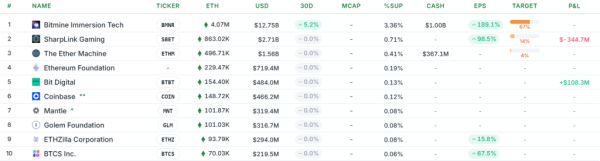 BitMine jest największym korporacyjnym posiadaczem Ethereum, kolejne miejsca zajmują SharpLink i The Ether Machine.