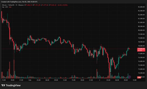 W chwili pisania tego tekstu pierwsza kryptowaluta była notowana po cenie ~77 600 USD (-1,8% dziennie).