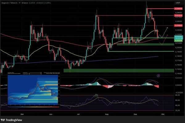 Wykres dzienny wyraźnie pokazuje, że DOGE pozostaje wierny swojemu ogólnemu trendowi wzrostowemu pomimo niedawnej wyprzedaży. W dłuższym horyzoncie czasowym nie uformowały się żadne głębsze dołki; zamiast tego cena nadal potwierdza schemat wyższych maksimów. Sugeruje to, że fundamentalna struktura rynku pozostaje nienaruszona.