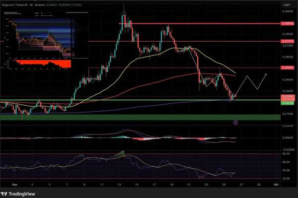 Wykres 4-godzinny sugeruje, że DOGE mógł znaleźć dno w pobliżu 800-minutowej średniej kroczącej (EMA). Cena wykazuje oznaki respektowania tego obszaru jako wsparcia, co może sprzyjać krótkoterminowej stabilizacji. Będzie to szczególnie istotne, jeśli cena będzie zmierzać w kierunku 200-minutowej i 50-minutowej średniej kroczącej (EMA). To zadecyduje, czy DOGE zdoła pokonać te opory i tym samym odblokować dalszy potencjał wzrostowy, czy też odrzucenie na tych średnich kroczących ponownie ograniczy próbę odbicia.