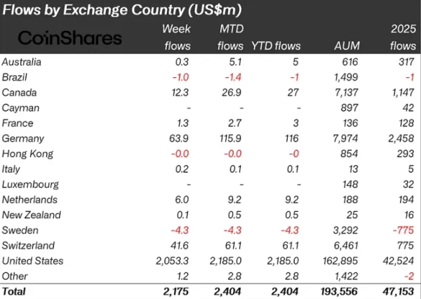 W ujęciu regionalnym dominują Stany Zjednoczone z napływem 2,05 mld dolarów. Na kolejnych miejscach plasują się Niemcy (63,9 mln dolarów), Szwajcaria (41,6 mln dolarów) i Kanada (12,3 mln dolarów).