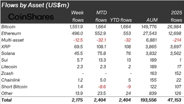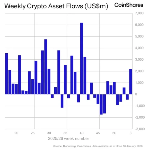 Według raportu CoinShares, od 10 do 16 stycznia napływ środków do produktów inwestycyjnych w kryptowaluty wyniósł 2,17 mld dolarów. To rekord od października 2025 roku.