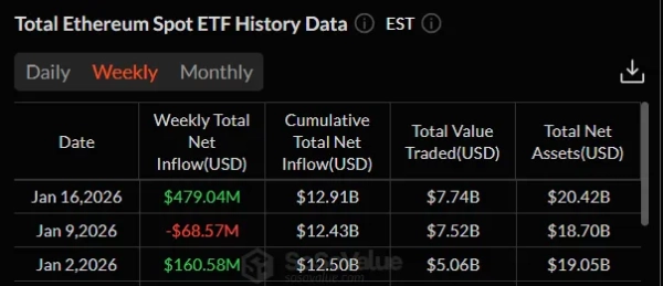 ETF-y spot Ethereum również wykazały dodatnią dynamikę. W ciągu jednego tygodnia przyciągnęły 479 milionów dolarów, co stanowi najlepszy wynik od października.