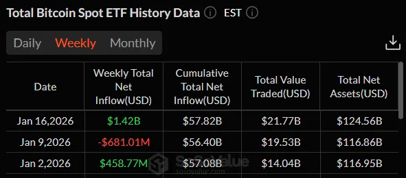 W zeszłym tygodniu napływ kapitału netto do amerykańskich funduszy ETF opartych na Bitcoinie wyniósł 1,42 miliarda dolarów. To najwyższy wynik tygodniowy od października.