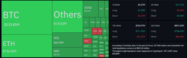 Jednak obecna korekta cen wywołała falę likwidacji. Według CoinGlass, wolumen zamkniętych pozycji przymusowych na rynku kryptowalut osiągnął 874,53 mln USD w ciągu 24 godzin. Główny cios spadł na traderów, którzy obstawiali wzrosty: straty na pozycjach długich wyniosły 788,05 mln USD.