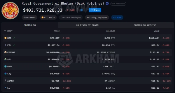 Władze Bhutanu wycofały z rezerw państwowych 284,8 BTC o wartości 22,3 mln dolarów. Poinformowała o tym platforma analityczna Arkham.