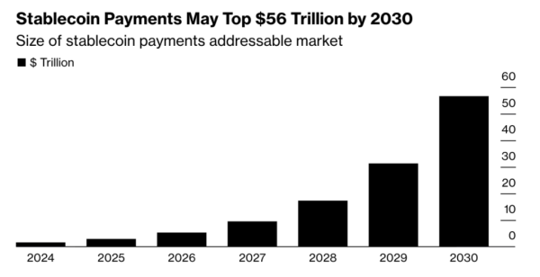 Analitycy Bloomberg Intelligence szacują, że do 2030 roku łączna wartość segmentu stablecoinów może osiągnąć 56 bilionów dolarów.