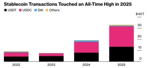 Łączna wartość transakcji przy użyciu „stabilnych monet” w 2025 r. wzrosła o 72% do 33 bilionów dolarów.