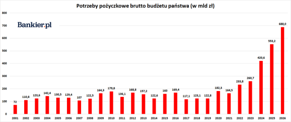 Kolejną zatrważającą statystyką są lawinowo rosnące potrzeby pożyczkowe rządu. Czyli kwota, jaką Ministerstwo Finansów musi pożyczyć w ciągu roku, aby pokryć bieżący deficyt fiskalny oraz wykupić zapadające obligacje (czyli zwrócić pieniądze inwestorom). W latach 2002-21 potrzeby pożyczkowe brutto mieściły się w przedziale 100-200 mld zł. Później jednak gwałtownie wzrosły. W roku 2022 wyniosły już 233,8 mld zł, rok później 260,7 mld zł, a w ubiegłym roku aż 420,6 mld zł. W bieżącym roku mają przekroczyć pół biliona złotych i według założeń budżetowych sięgnąć 688 mld zł w roku 2026.