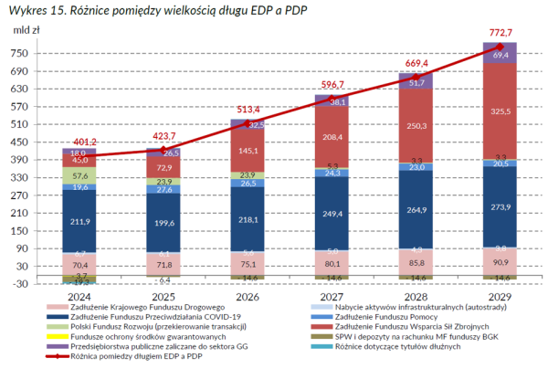 W bieżącym roku w tych „pozabudżetowych funduszach, znajdujących się poza kontrolą Parlamentu” zgromadziło się 423,7 mld złotych długu. I zgodnie z założeniami Strategii w najbliższych latach kwota ta będzie dynamicznie rosła, osiągając 772,7 mld zł w roku 2029. Głównie za sprawą Funduszu Wsparcia Sił Zbrojnych, czyli kolejnego pozabudżetowego tworu poprzedniej ekipy rządzącej. I który obecna władza bezkrytycznie zaakceptowała.