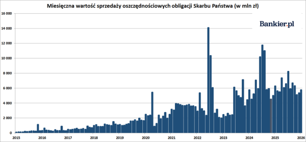 W styczniu 2026 roku Ministerstwo Finansów zaoferowało na sprzedaż detaliczne obligacje skarbowe o wartości 5,76 mld złotych. Chociaż ten wynik jest o 8,1% gorszy w porównaniu z rokiem ubiegłym, jednocześnie przewyższa o 7,6% wynik z grudnia, kiedy to perspektywa utraty rocznego limitu wpłat na konta IKE/IKZE zachęcała do nabycia. Z tej sumy 990,6 mln zł stanowiła konwersja obligacji dobiegających końca na papiery nowej emisji, co oznacza, że realnie MF zyskało 4,77 mld zł.
