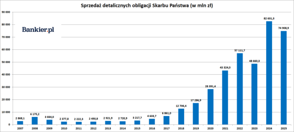 W ciągu całego minionego roku Ministerstwo Finansów rozprowadziło detaliczne obligacje skarbowe na kwotę blisko 75 mld złotych, z czego kwota 13 mld zł stanowiła zamianę obligacji kończących się na papiery nowej emisji. Nadal był to wynik ukazujący znaczne zainteresowanie ofertą MF, jednakże nieco mniejszy od rekordowych 82,6 mld zł osiągniętych w roku 2024.