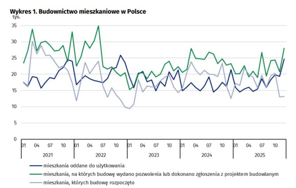Podobny spadek firmy deweloperskie odnotowały w aspekcie zezwoleń na budowę. Niedawno zakończony 2025 r. zapewnił im niecałe 171,5 tys. pozwoleń – o 16,6 proc. mniej niż w 2024 r. W ostatnim miesiącu roku urzędy wydały jednak decyzje umożliwiające w przyszłości budowę ponad 20 tys. mieszkań, co było najwyższym grudniowym rezultatem od czterech lat i jednocześnie najwyższym miesięcznym wynikiem od czerwca 2022 r.