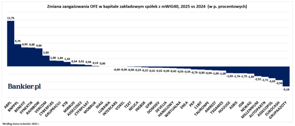 Wśród „maluchów” aktywność OFE była bardzo różnorodna, z wyraźnym ukierunkowaniem na konkretne perełki dywidendowe i wzrostowe. Największym beneficjentem przypływu środków okazał się deweloper Murapol, gdzie fundusze podwyższyły udział o 9,70 p.p. (do 17,90%). Nie zaskoczy to osób śledzących tekst od początku, że i tu znaczący wzrost zaangażowania należy skojarzyć z ABB, które na akcjach spółki miało miejsce w 2025 r. Spora zwyżka zanotował również fundusz MCI (+5,26 p.p.), wynik Arlenu to przede wszystkim efekt wzięcia udziału OFE w IPO firmy w minionym roku.