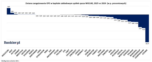 Portfele OFE na koniec roku 2025 w segmencie spółek spoza indeksu WIG140 wykazuje wyraźną tendencję selekcji. Fundusze konsekwentnie unikają spółek o charakterze spekulacyjnym lub borykających się z problemami finansowymi, skupiając się jedynie na wyselekcjonowanej grupie emitentów.