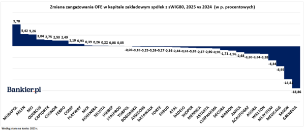 Z drugiej strony OFE całkowicie zlikwidowały pozycję w MLSystem, gdzie udział spadł z 6,34% do 0,00%. Fundusze niemal kompletnie wycofały się też z Medicalgorithmics (spadek o 8,95 p.p. do poziomu 0,85%). Najbardziej drastyczne cięcie udziałów wśród spółek z sWIG80 dotyczyło spółki Grenevia, gdzie udział OFE skurczył się o 18,86 p.p. (z 34,42% do 15,56%). Warto jednak pamiętać, że w 2025 r. kontrolujący Grenvię TDJ Equity I przeprowadził wezwanie na akcje, w której nawet podnosił cenę, aby zachęcić innych akcjonariuszy do sprzedaży. Jak widać OFE, przynajmniej częściowo, skorzystały z tej propozycji.
