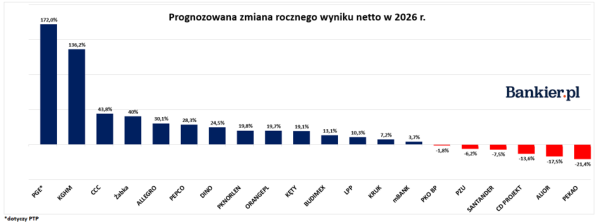 Dane wskazują na duże zaufanie w polskiego konsumenta. SpółkaCCC ma zanotować progres zysku o 43,8 proc. Podobny optymizm cechuje prognozy dlaGrupy Żabka (40,0%) oraz Allegro (30,1%). Warto zwrócić uwagę na Pepco (28,3%)oraz Dino Polska (24,5%). W tej grupie spółek lekko wyróżnia się LPP (10,3proc.), chociaż jak wspomnieliśmy to spółka, którą jako TOP PICKS na 2026 r.wskazało każde z 9 biur maklerskich publikujących swoje rekomendacje.
