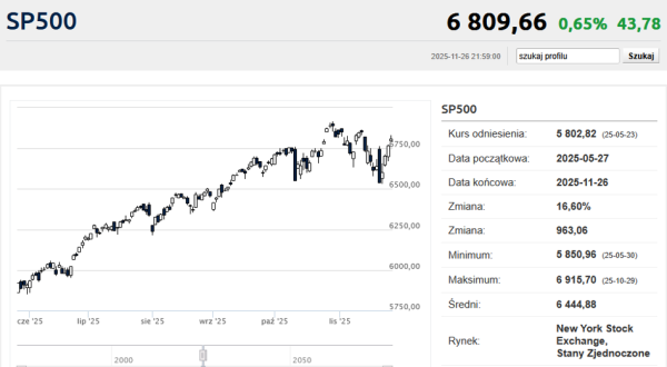 S&P500 zakończył środową sesję na poziomie 6 812,61 pkt., oznaczającym zwyżkę o 0,69%. Nasdaq Composite, po wzroście o 0,82%, osiągnął pułap 23 214,69 pkt. W obu przypadkach był to czwarty z rzędu dzień wzrostów i powrót w okolice październikowego maksimum. Coraz bliżej niedawnego rekordu wszech czasów jest również średnia przemysłowa Dow Jonesa, która w środę zwiększyła się o 0,67% i osiągnęła wartość 47 427,12 pkt.
