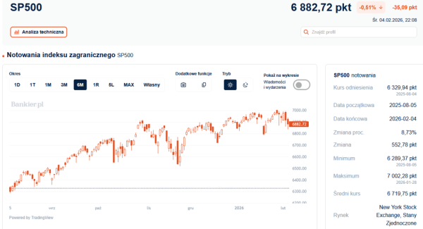 S&P500 spadł o 0,51% i zamknął się nawartości 6 882,72 pkt. Ten benchmark również odnotował drugą spadkową sesjęz rzędu i oddalił się od pułapu 7 000 punktów, który dwukrotnie testował naprzełomie stycznia i lutego. Jeszcze jedna taka spadkowa sesja i sytuacjatechniczna stanie się ciekawa z perspektywy giełdowych pesymistów.