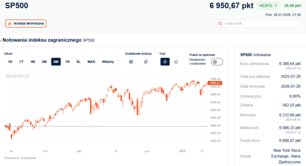 Indeks S&P500 zakończył poniedziałkową sesję wzrostem o 0,57%, osiągając poziom 6 950,53 pkt. Brakuje mu już tylko 35 punktów do historycznego maksimum sprzed dwóch tygodni. Także Nasdaq w znacznym stopniu odrobił straty poniesione podczas „kryzysu grenlandzkiego”, kiedy to groźba wprowadzenia nowych ceł na 8 państw europejskich wywołała na Wall Street najsilniejsze spadki od października. Owa „korekta” potrwała zaledwie dwa dni.