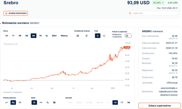 Biały metal od dłuższego czasu wzbudza silne emocje wśród inwestorów, będąc aktywem o najszybszym tempie wzrostu wartości na świecie. Srebro jest obecnie o niemal 200% droższe niż dwanaście miesięcy temu i od dwóch miesięcy rośnie w zatrważającym tempie, ustanawiając nominalne rekordy wszech czasów. Więcej informacji na temat białego metalu można znaleźć w artykule pod tytułem „Srebro po 100 dolarów za uncję?”.