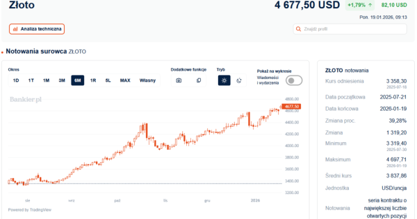 O godzinie 9:13 kurs złota w relacji do dolara amerykańskiego obniżył się do 4 677,50 USD/oz., co nadal stanowiło wzrost o 1,8%. Taka reakcja jest objaśniana zaostrzeniem się sytuacji politycznej na osi USA-Europa. W odpowiedzi na „Deklarację Ośmiu” wyrażającą poparcie dla duńskiej kontroli nad Grenlandią, prezydent USA Donald Trump zasygnalizował wprowadzenie 10-procentowych ceł na produkty importowane z tych 8 krajów europejskich.