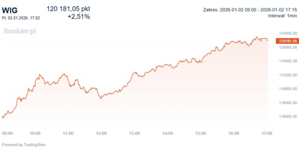 W piątek na koniec dnia WIG20 poszybował w górę o 2,46 proc. do poziomu 3 262,48 pkt i stał się najmocniejszym głównym indeksem w Europie. WIG zakończył dzień wzrostem o 2,51 proc. do 120 181,05 pkt. Z kolei mWIG40 zyskał 2,77 proc., a sWIG80 2,52 proc. Wolumen obrotu na szerokim rynku oszacowano na 2,08 mld zł, z czego 1,6 mld zł przypadło na WIG20.