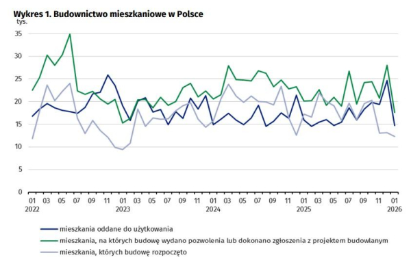Główny Urząd Statystyczny zanotował w styczniu 2026 roku niespełna 8,9 tys. rozpoczętych budów oraz 8,6 tys. mieszkań oddanych do użytku przez deweloperów. Są to najmniej korzystne wyniki od trzech lat, na które, zwłaszcza w pierwszym przypadku, wpłynęła chłodniejsza i bardziej śnieżna niż w poprzednich latach zima.