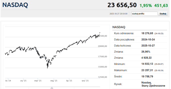 Średnia przemysłowa Dow Jonesa zyskała w poniedziałek 0,71% i zakończyła dzień na poziomie 47 544,59 pkt. To rekordowo wysoki kurs na zamknięciu sesji. Podobnie jak w przypadku indeksu S&P500, który wzrósł o 1,23% i osiągnął pułap 6 875,15 pkt. Aktualnie S&P500 jest wyżej o 42% niż podczas zenitu kwietniowej paniki związanej z polityką celną prezydenta Trumpa.