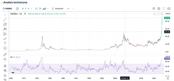 Natomiast kompletnie poza skalą znalazł się techniczny wskaźnik RSI, który ilustruje poziom wykupienia lub wyprzedania rynku. 14-miesięczny (!) RSI w momencie pisania tego tekstu sięgał 92,3 i był niemal rekordowo wysoki. Wskaźnik ten znalazł się znacznie wyżej niż w marcu 2011, kwietniu 2006 czy marcu 2004. Jedynymi porównywalnymi analogiami są te ze stycznia 1980 oraz marca 1974. Zatem na gruncie technicznym rynek srebra jest obecnie skrajnie wykupiony, co grozi głęboką i bardzo dynamiczną korektą.