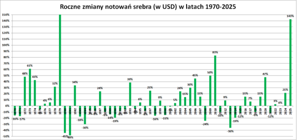 Pomimo gwałtownego spadku w grudniu 2025 roku, notowania srebra w dolarach wzrosły o imponujące 143%! A tylko od początku bieżącego roku (czyli w ciągu 9 sesji) wzrosły o blisko 30%. Mówimy przecież o srebrze – fizycznym metalu, który aż do XX wieku przez tysiąclecia pełnił rolę uniwersalnego środka płatniczego. To nie jest żaden mem, spółka z NewConnect ani inny cyfrowy „shitcoin”. To jest srebro, i choćby z powodu jego historii, zasługuje na szacunek. Oraz zainteresowanie z uwagi na tak spektakularne wyniki.