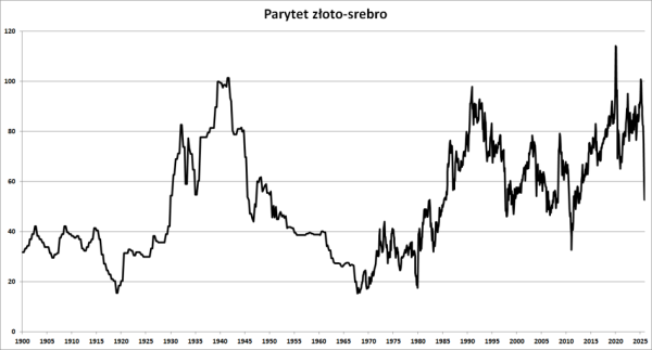 Od tego czasu parytet złoto/srebro „szaleje” w zakresie od 20 do nawet 120. W ciągu minionych 50 lat tę pierwszą wartość zarejestrowano tylko raz: podczas apogeum operacji braci Hunt na przełomie lat 1979/80. Później wszystko poniżej 40 okazywało się krótkotrwałą aberracją, występującą jedynie kilkukrotnie: w roku 2011, 1998 oraz 1983. Od czasu zerwania z systemem Bretton Woods (w lipcu 1971 roku) mediana relacji cen złota i srebra wynosi 63,84.