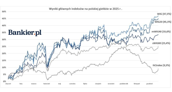 Hossa na GPW w 2025 r. spowodowała, że wszystkie kluczowe indeksy odnotowały imponujące stopy zwrotu. Wśród sektorów dominowały wydobycie oraz paliwa, lecz nie zawiodły także banki. W WIG20 wyceny walorów niemal wszystkich spółek wzrosły w ciągu ostatnich 12 miesięcy. Weryfikujemy również, które firmy z szerokiego rynku umożliwiły najwięcej zarobić w tym wyjątkowym roku, a które okazały się giełdowymi przegranymi. Prezentujemy, jak wypadła polska giełda na tle światowych rynków.