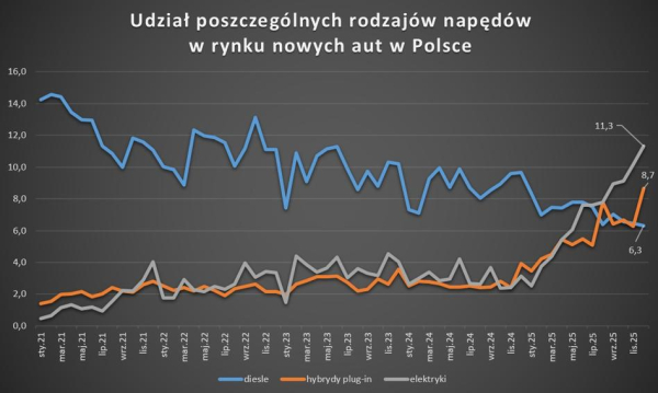 W 2025 r. w Polsce zarejestrowano ponad 43,3 tys. nowych pojazdów elektrycznych. Po raz pierwszy w historii aut elektrycznych przybyło więcej niż diesli. Niespotykany rekord padł w grudniu, kiedy to pojazdy, jakie można zasilać prądem z gniazdka (też hybrydy plug-in), tworzyły 20 proc. całego rynku. Nad sektor nadciągają jednakże złe prognozy.