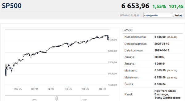 S&P500 zamknął poniedziałkową sesję wzrostem o 1,56% i uplasował się na poziomie 6 654,72 pkt. Nasdaq Composite poszybował w górę o 2,21% i osiągnął pułap 22 694,61 pkt. Dow Jones zyskał na wartości o 1,29% i na finiszu sesji odnotował wynik 46 067,58 punktów.