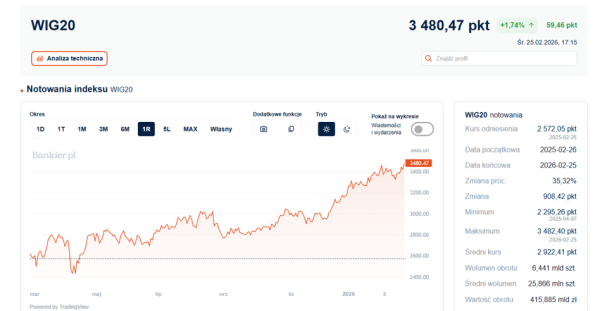 Wśród największych spółek dominowały wzrosty, które podwyższyły kursy 16 spółek. Poza KGHM wyróżniły się walory CD Projekt (3,75 proc.), Budimeksu (2,71 proc.) oraz PKO (2,18 proc.) i PZU (2,13 proc.). W odniesieniu do Budimeksu, będącego liderem w branży budowlanej, warto wspomnieć, że firma opublikowała wyniki za 2025 rok, które, choć zgodne z prognozami, ukazały portfel zamówień na poziomie 16,2 mld zł – niższym niż rok wcześniej.