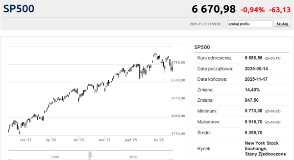 W poniedziałek Nasdaq Compositezakończył sesję spadkiem o 0,86% z wynikiem 22 708,07 punktów. S&P500obniżył się o 0,92% i finiszował na poziomie 6 672,41 pkt. Dow Jonesstracił 1,18% i zamknął dzień na poziomie 46 590,24 pkt. Indeks zmiennościVIX, mimo wzrostu o niemal 13%, wciąż utrzymywał się na stosunkowo spokojnympoziomie 22,38 pkt.